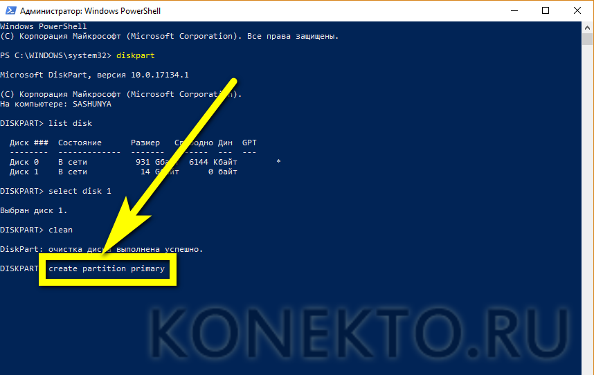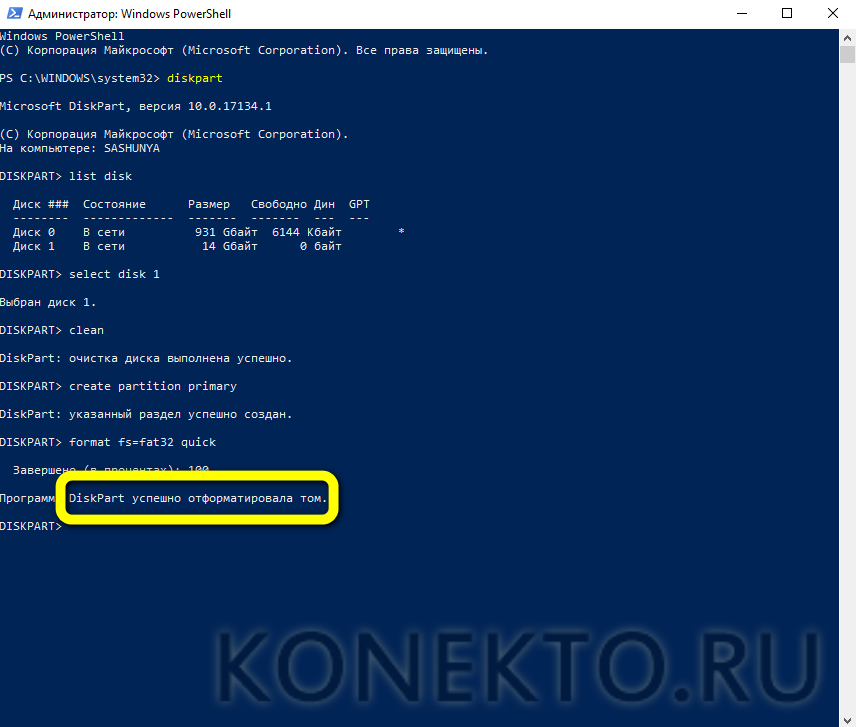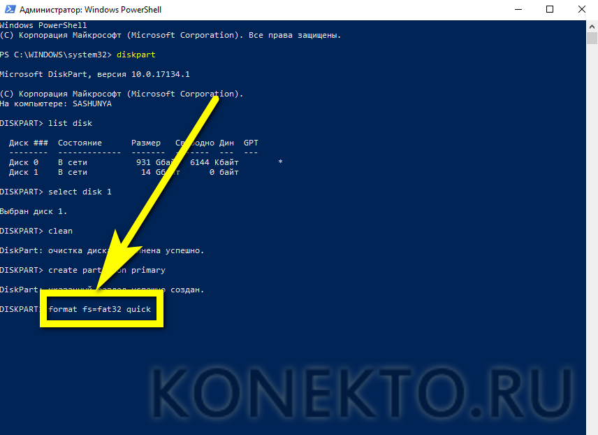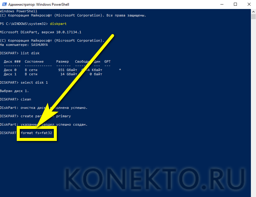 И, наконец, format fs=ФС quick, где ФС — файловая система флешки: здесь нужно подставить без лишних пробелов и кавычек параметр fat32 или ntfs.