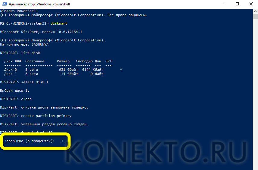 Дождаться завершения форматирования — на это может уйти от нескольких минут до часа-полутора, в зависимости от текущего состояния съёмного носителя. Закрывать окно Windows PowerShell или командной строки до окончания работы ОС нельзя.