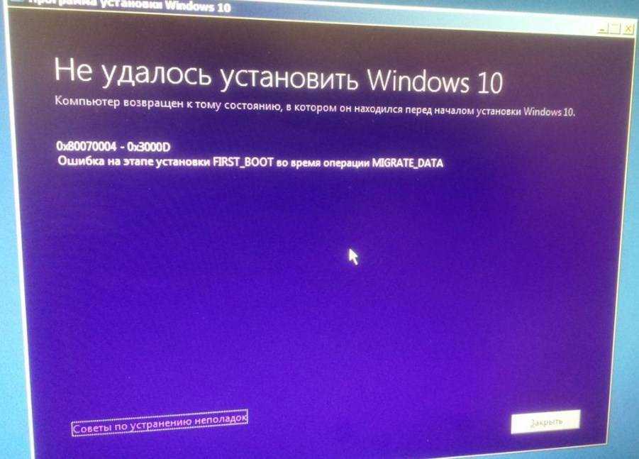 - На компьютере начинается установка операционной системы, пользователь задает требуемые параметры. Но вместо уведомления о завершении процесса установки, на экране видит сообщение о невозможности установить операционную систему.