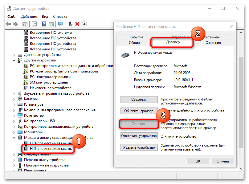 Противоположная предыдущей рекомендация: вероятно, при установке ПО возник сбой, из-за чего драйвер оказался инсталлирован некорректно. В Windows 10 есть возможность откатить его версию до предыдущего состояния. Для этого запустите «Диспетчер устройств», отыщите то устройство, из-за которого, как вам кажется, происходит сбой, дважды щелкните ЛКМ по его названию. В окне со свойствами перейдите на вкладку «Драйвер». Если кнопка «Откатить» активна, используйте ее, чтобы вернуть предыдущую версию ПО.