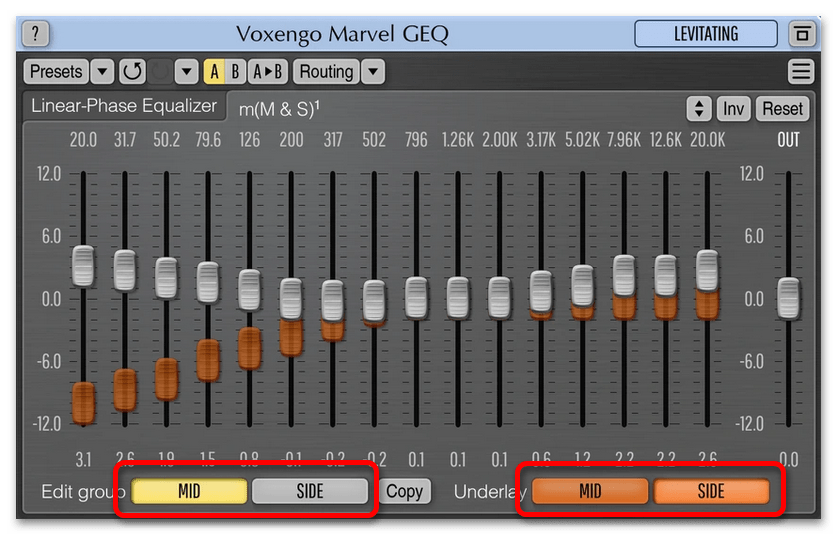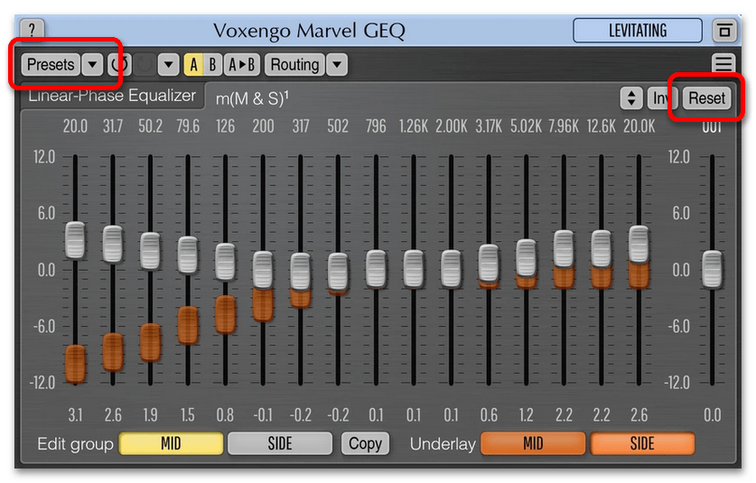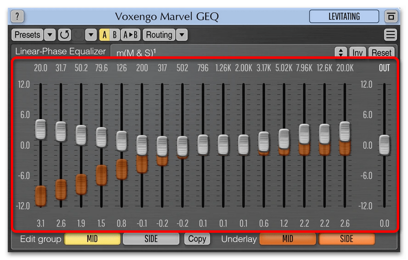 В нижней части окна приложения находятся функциональные кнопки для выбора режима обработки потокового сигнала. «MID» — служит для настройки одноканального сигнала, то есть моно. «SIDE» позволяет эффективно работать со стереосигналом. Программа Voxengo Marvel GEQ отлично подойдет неопытным пользователям, которым нужно изменить звучание воспроизводимого на компьютере аудиопотока. Недостатком, пусть и не критическим, является отсутствие перевода на русский язык.