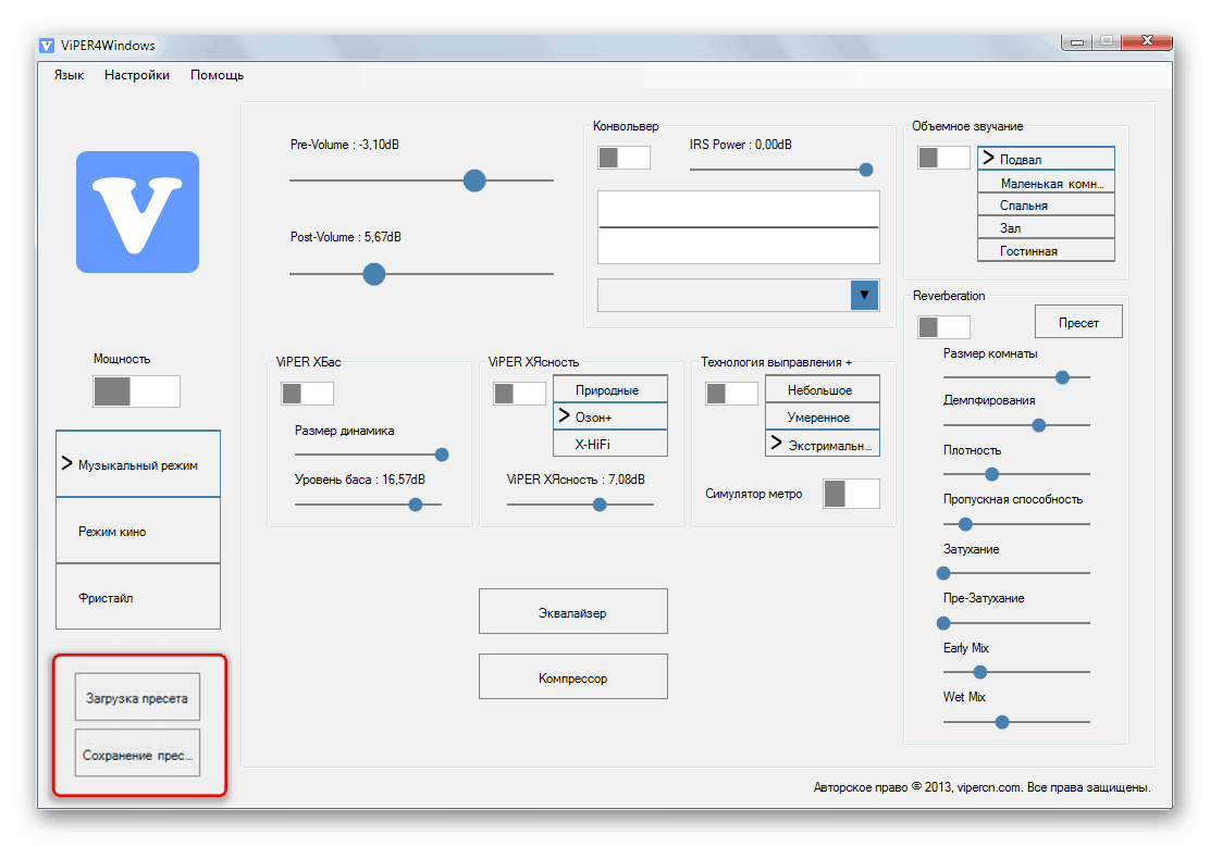 Также профессионалам в мире музыки будет приятно узнать, что Viper4Windows обладает функцией ревербераци, в нем есть компрессор, лимитер и много чего еще.