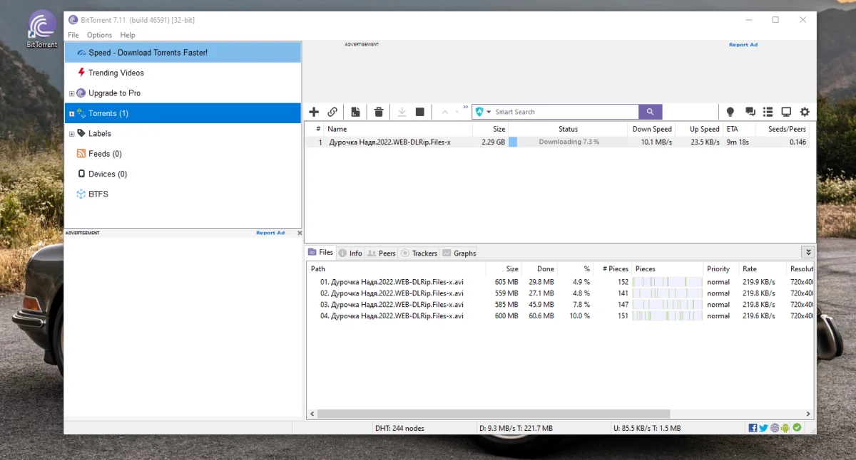 Пользоваться BitTorrent можно двумя способами, первое классическое настольное приложение для Windows (как на фото) и дополнительным Web приложением, для загрузки файлов. Во всех вариантах есть, мультиязычный интерфейс и платные, более безопасные версии Pro, без рекламы, с поддержкой VPN и встроенным проигрывателем. Есть возможность загружать несколько торрент-файлов одновременно, и выбирать приоритет для загрузок и файлов.