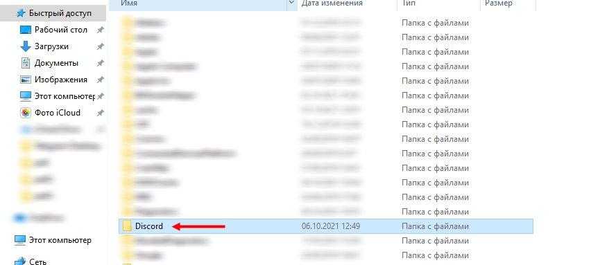 - Откроется папка, которая ранее была скрытой. В ней внимательно просмотреть список и уничтожить все, где есть упоминание слова Discord. Предварительно нужно убедиться, что сама программа в этот момент отключена полностью.