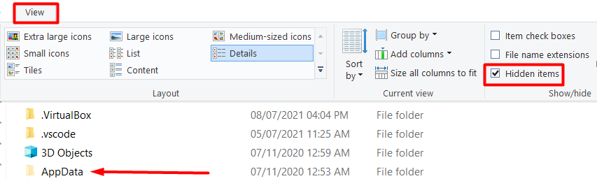 - If you are unable to see the AppData folder, you may need to turn on the option that enables you to view hidden files and folders. Click on the “View” tab on File Explorer’s menu and click on the “Hidden items” checkbox in the Show/hide section. File Explorer will show the hidden files and will remember this option until you change it again.
