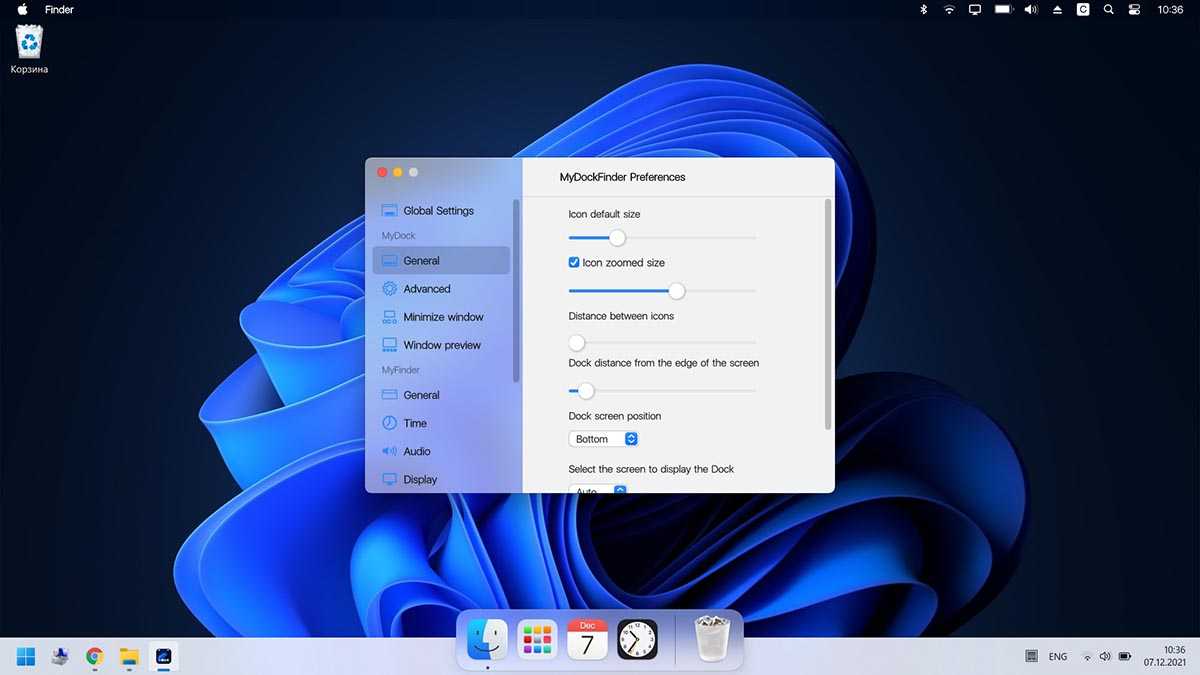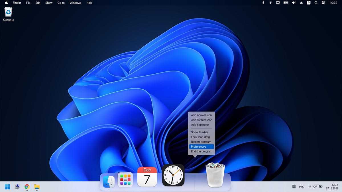 Для простоты и удобства воспользуемся комплексным решением от китайских разработчиков. Они выпустили утилиту MyDockFinder, которая маскирует большинство элементов рабочего стола Windows и добавляет недостающие модули из macOS вроде док-панели или меню Launchpad.