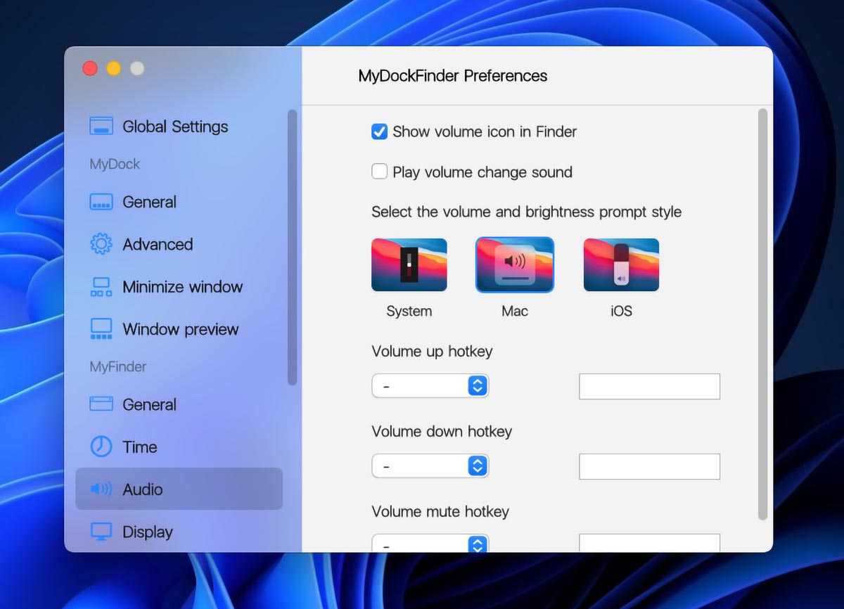 10. Особого внимания заслуживает блок параметров Audio. Здесь можно изменить стандартную графику для регулировки уровня громкости компьютера. Можно оставить классический Windows-индикатор, стандартное меню из macOS или минималистичный боковой слайдер из iOS.
