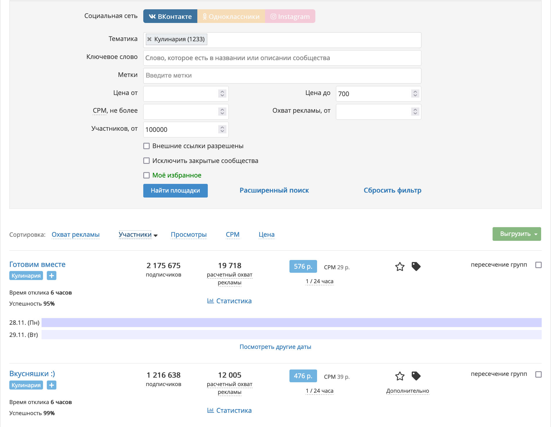 Чтобы искать подходящие паблики и блогеров было проще, используют биржи — вот, например, окно поиска пабликов в бирже Sociate