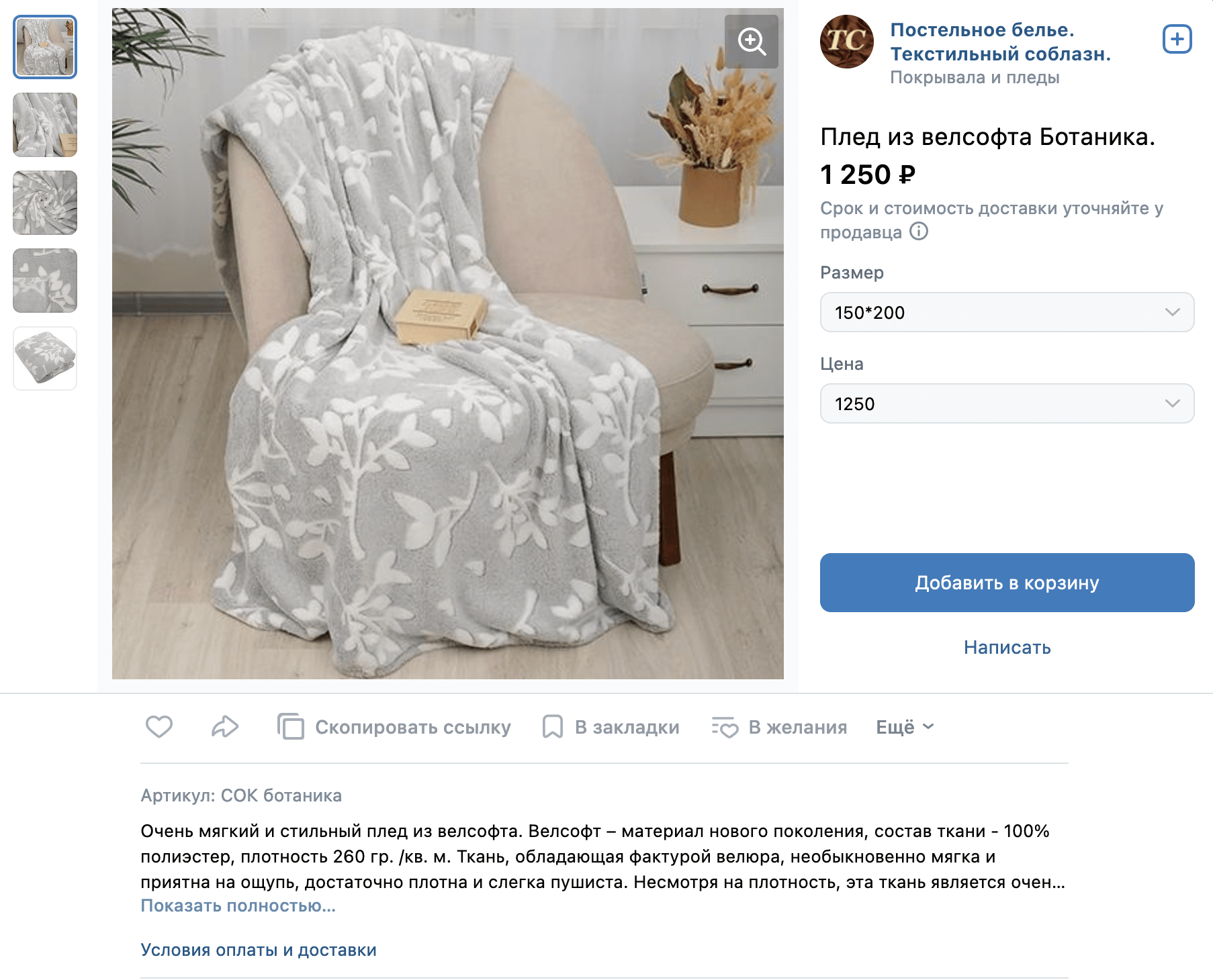 В карточке товара можно разместить фотографии и подробное описание, поставить ссылку на диалог с продавцом