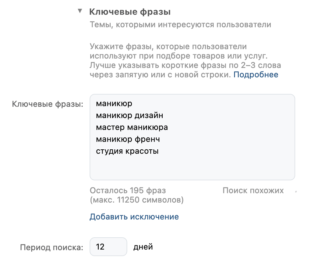 Таргетинг может быть разным, например «ВКонтакте» позволяет выбрать аудиторию, в том числе по ключевым фразам