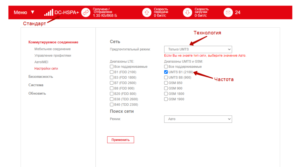 - HSDPA– высокоскоростная передача пакетных данных, по нисходящим каналам, базовой станции к абоненту. Использование протокола HSDPA (3,5G) позволяет достигать скорости до 10 Мбит/с.