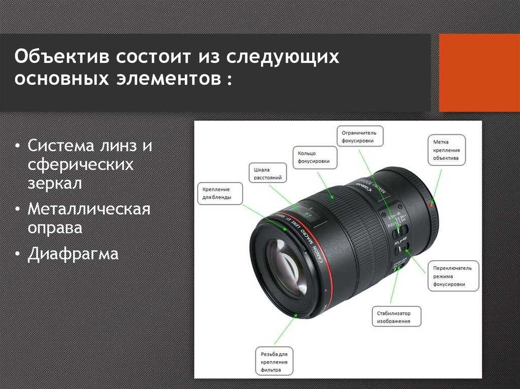 В состав современного объектива входят линзы (до десяти и больше), сферические зеркала, элементы крепления и управления, электронные системы. Для примера показан сменный объектив Nikon. Сложность устройства с необходимостью ведёт к возможным многочисленным отклонениям в его работе от принятых стандартов.