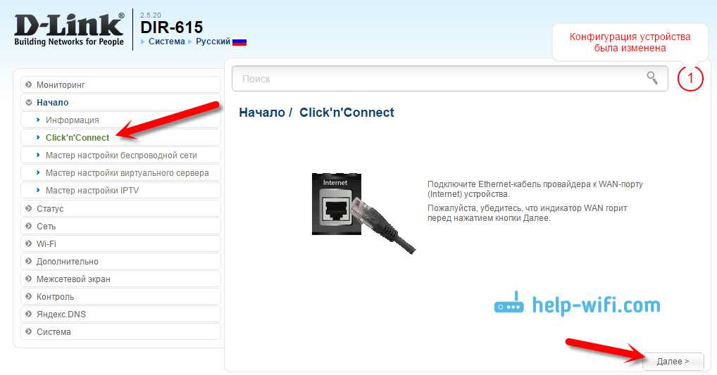 Перейдите на вкладку Начало — Click’n’Connect. Проверьте подключен ли Ethernet кабель и нажмите на кнопку Далее.