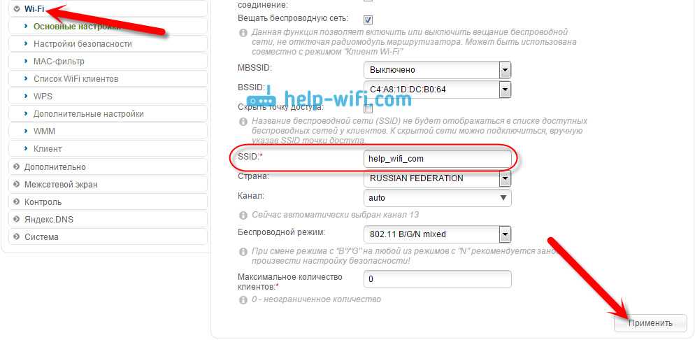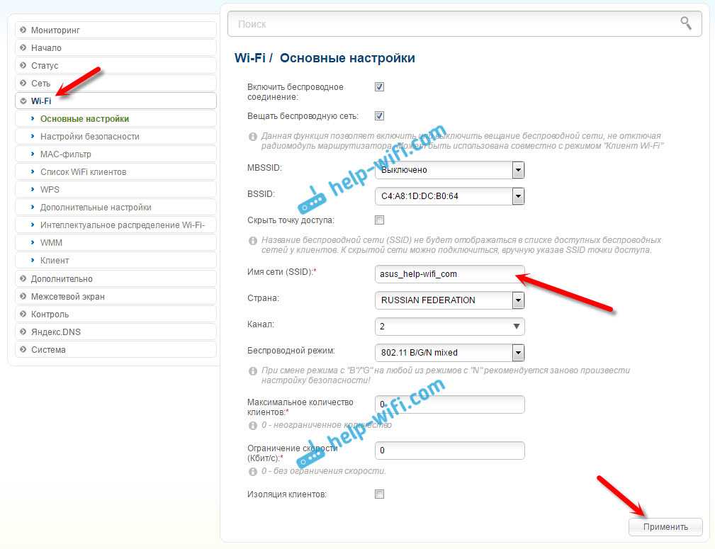 Перейдите на вкладку Wi-Fi — Основные настройки. Здесь мы будем менять имя нашего Wi-Fi. В поле SSID укажите название вашей сети. Нажмите кнопку Применить.