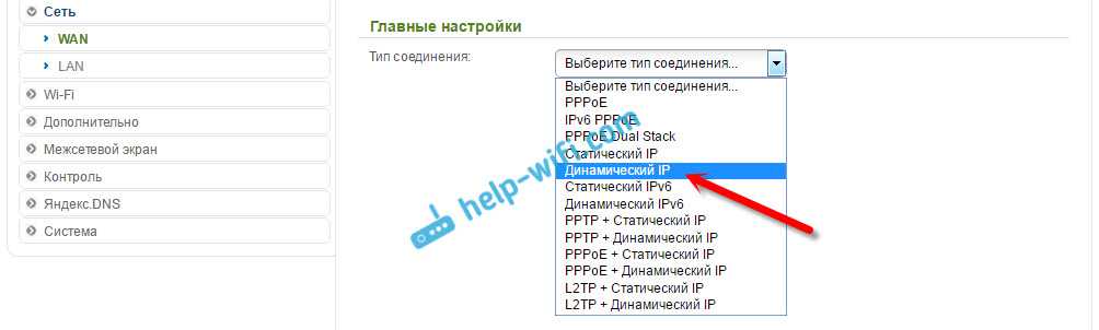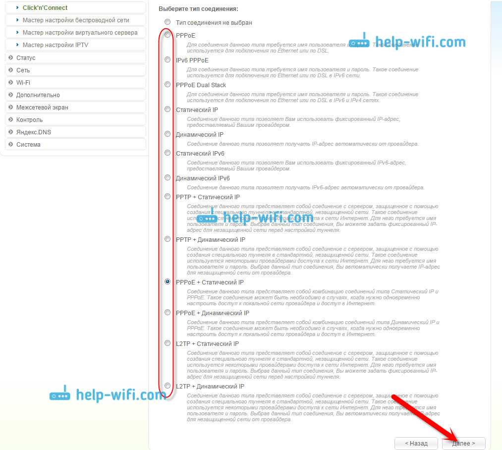 Выберите из списка ваше соединение. Если у вас например PPPoE и провайдер предоставляет еще и IP адрес, то выбираем PPPoE+Статический IP. Если IP нет, то выбираем просто PPPoE+Динамический IP. Или точно так же с L2TP.