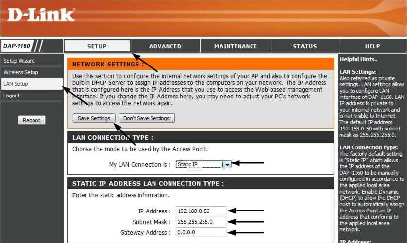 В поле My LAN Connetction ставим значение Static IP. Далее надо прописать IP-адрес точки доступа, маску и шлюз. Если Вы подключаете DAP-1150 к роутеру или модему в режиме маршрутизатора, то IP-адрес надо указывать из подсети роутера. Если у Вас роутер D-Link, то менять ничего не надо. Просто нажимаете Apply. В противном случае, в поле Gateway (шлюз) прописываем адрес роутера — в большинстве случаев 192.168.1.1. Соответственно IP-адрес надо так же указать из этой подсети — например, 192.168.1.50.