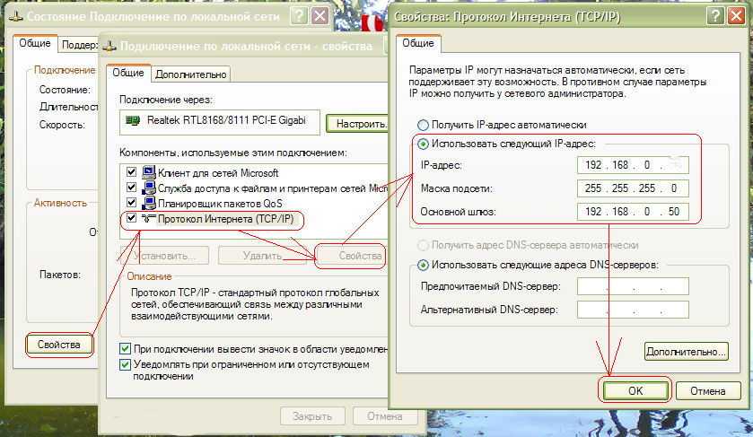 - Нажмите на свойства протокола, в появившемся окне внесите такую информацию: IP-адрес — 192.168.0.100., маска подсети — 255.255.255.0., основной шлюз — 192.168.0.50.