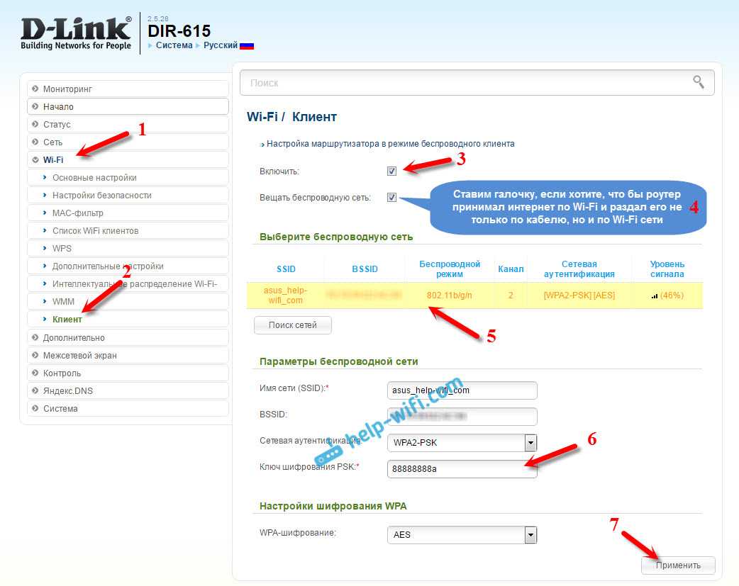 Для активации режима понадобится перейти в меню «Клиент» раздела Wi-Fi и отметить галочку «Включить».
