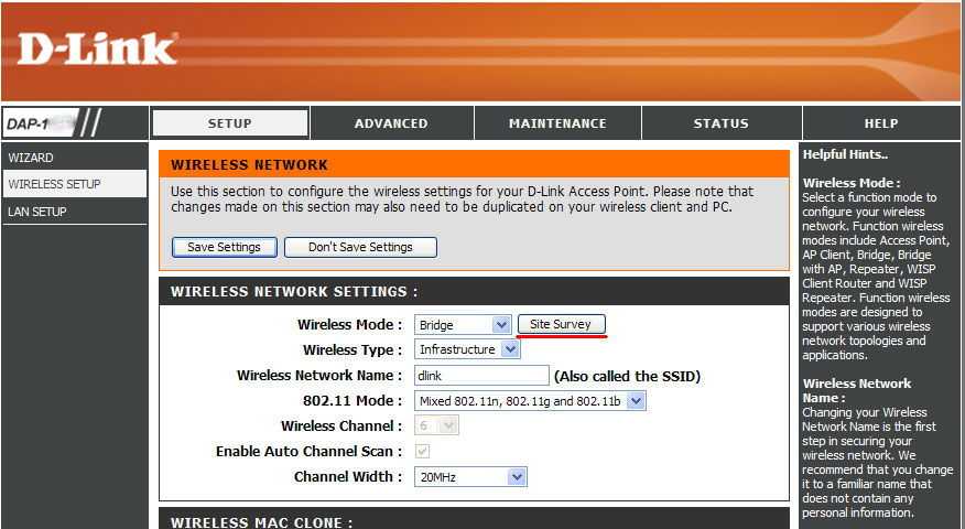 В открывшемся разделе Wireless Setup настраиваем следующие параметры:Wireless Network Name (имя беспроводной сети) или SSID — можно оставить без изменения — dlink, но лучше прописать своё какое-либо название сети. Имейте ввиду, что SSID не должен содержать пробелов и спецсимволов, в случае, если такие символы имеются, устройству будет произведен сброс настроек на заводские.Security Mode (тип шифрование ключа безопасности) — желательно выставлять WPA2 Wireless Security (enchanted). Простой WPA стоит выбирать только в том случае, если этот тип шифрования не поддерживается устройством с которого планируете подключаться к WiFi.Cipher Type (шифрование) — я бы рекомендовал режим TKIP, т.к. данное шифрование более универсальное и поддерживается большинством типов устройств. Если не планируется использовать какие-либо другие устройства то необходимо выставить AES, т.к оно более защищенное.PSK / EAP — ставим переключатель в режим Personal.Passphrase (ключ шифрования) и Confirmed Passphase (подтверждение ключа) — любая буквенная или цифирная последовательность не короче 8 символов в латинской раскладке.
