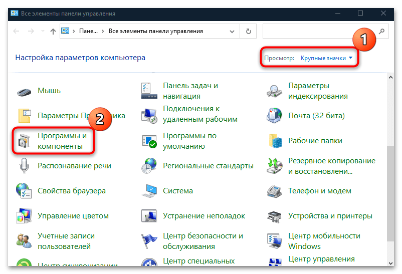 В качестве просмотра разделов выберите мелкие или крупные значки, затем перейдите в «Программы и компоненты».