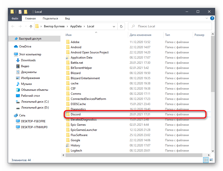 Иногда проблемы с установкой апдейтов связаны со стандартным расположением каталога Discord, и решается эта ситуация банальным его перемещением с дальнейшим указанием нового пути. Для этого понадобится произвести всего пару простых шагов:
