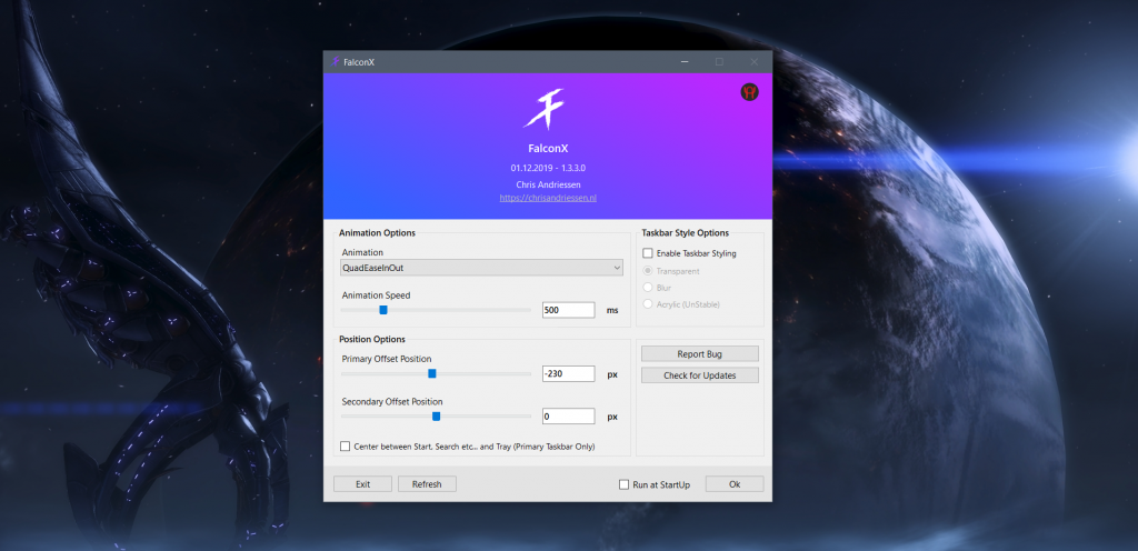 При желании можно добавить такое отображение значков и в Windows. Для этого вам понадобится бесплатная утилита FalconX, скачать которую можно с официального сайта. Программа не требует установки и после запуска прячется в значках с правой стороны Панели задач. К сожалению, ее интерфейс не имеет русского языка, однако настройки и так интуитивно понятны: можно выбрать отступы от центра экрана в пикселях, а также анимацию «расширения» Панели задач: