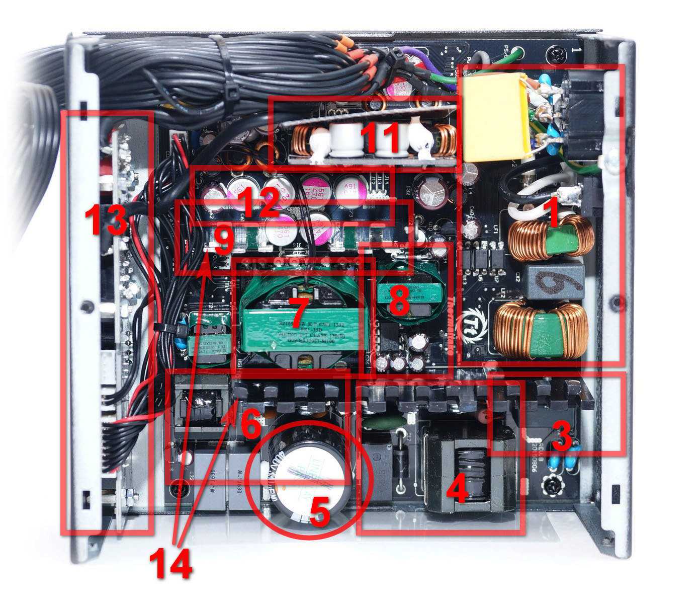 Фильтр электромагнитных помех в виде конденсаторов и дросселей. Если он отсутствует, а такое возможно в очень бюджетных моделях, то такой БП не следует рассматривать к покупке. Часть фильтра распаивается непосредственно на розетке.