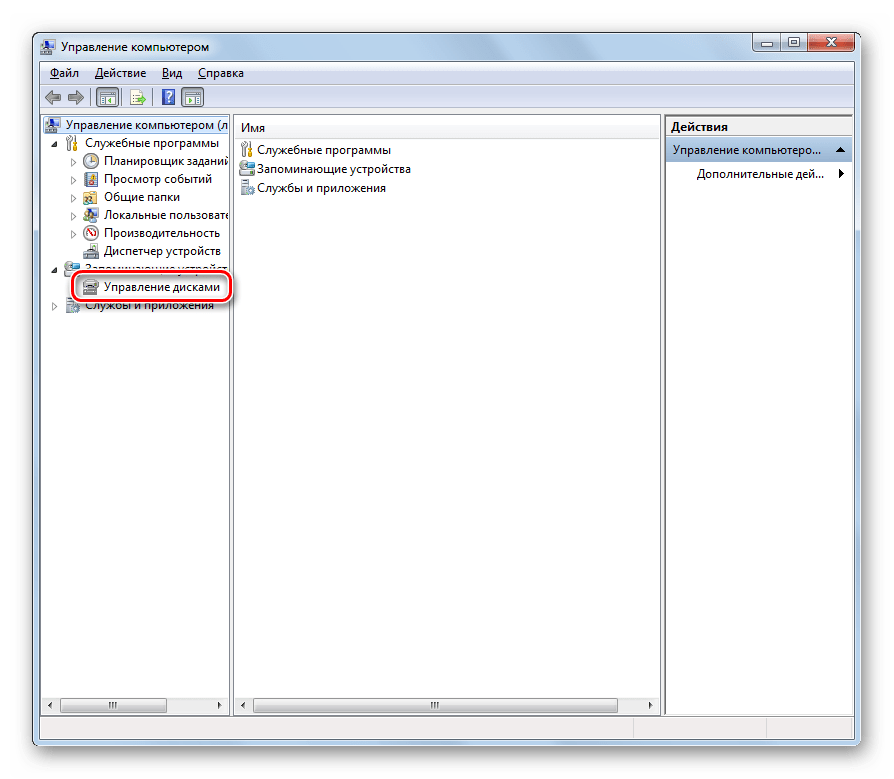 Теперь выясним что делать, если на флешке отсутствует разметка разделов. Сразу нужно отметить, что и в этом случае данные восстановить будет невозможно, а получится только реанимировать само устройство. Исправить ситуацию можно путем применения штатного инструмента системы под названием «Управление дисками». Мы рассмотрим алгоритм действий на примере Windows 7, но в целом он вполне подойдет и для всех других ОС линейки Виндовс.
