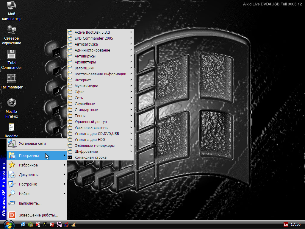 Интеграция Alkid Live CD проходит в три простых этапа. Сначала распаковываем из образа в корень флешки файлы bootfont.bin и \A386\ntdetect.com, а также каталог \PLOP. Затем копируем на флешку каталоги \A386\ и \PROGRAMS\ целиком, после чего переименовываем \A386\ в \miniNT. В меню добавляем следующие строки: