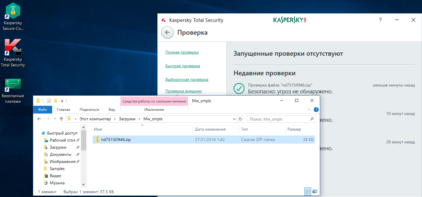 Примечательно, что Kaspersky Total Security не учится на своих ошибках. При повторной проверке архива тот снова был признан чистым, хотя распакованный из него файл только что вызвал срабатывание по результатам анализа в KSN.