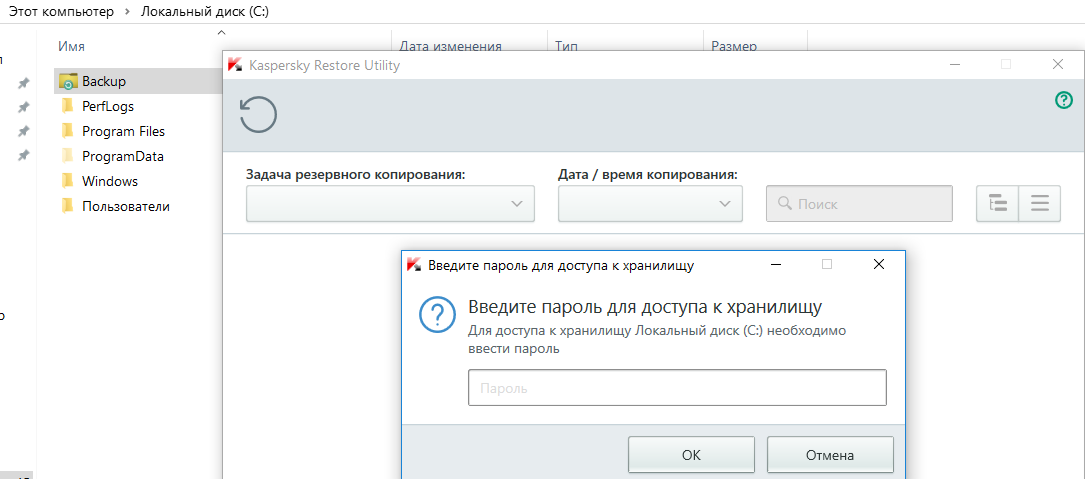 Штатными средствами даже администратор может только посмотреть свойства этой папки. При попытке войти в нее автоматически запускается менеджер бэкапов KTS и просит ввести пароль, если он был задан ранее.