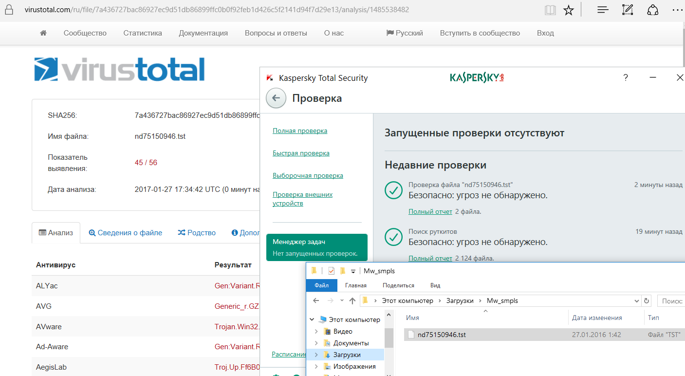 В каталог «Загрузки» попал только один файл из пятнадцати — — это как раз Trojan.Downloader, причем давно известный. При его дополнительной проверке по запросу KTS вновь счел файл безопасным. Сорок пять антивирусных сканеров на VirusTotal с ним не согласились.