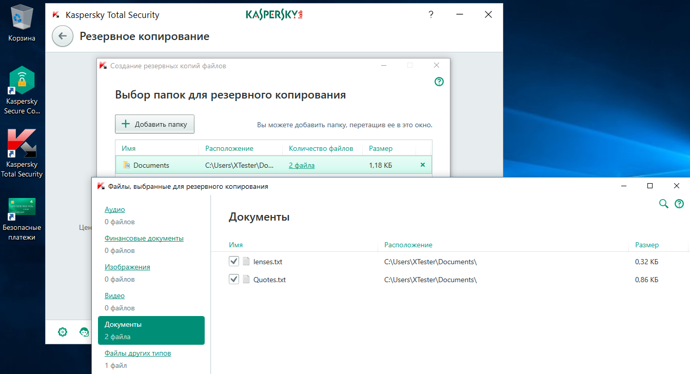 После чего мы открыли модуль «Резервное копирование и восстановление» и забэкапили эти документы в папку Backup прямо на системном разделе. В реальной ситуации стоит выбирать другое расположение (например, внешний диск), но для нашего теста оно роли не играет. Доступ к этой папке в любом случае контролируется средствами KTS, и через стандартный драйвер файловой системы трояны не могут с ней взаимодействовать.