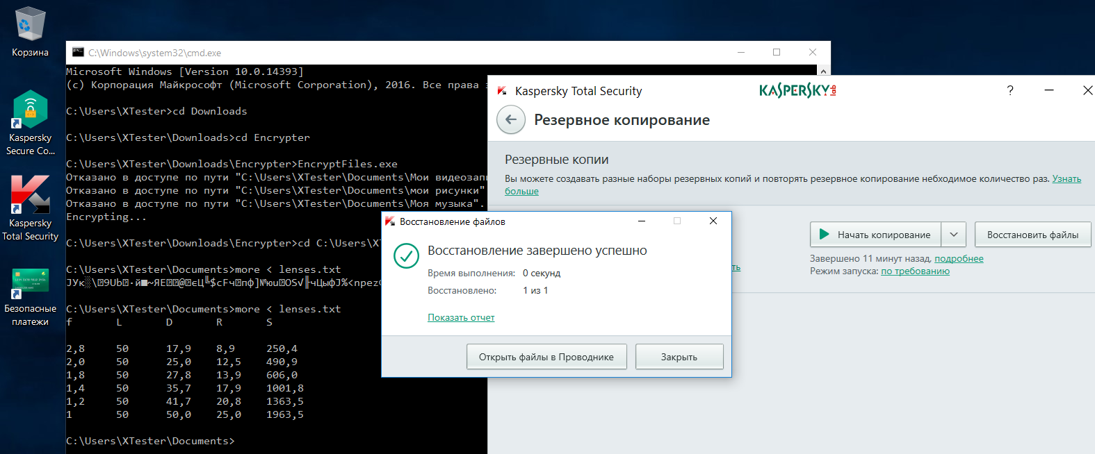 Нашу программу-имитатор KTS проигнорировал. Она спокойно зашифровала файлы, превратив их содержимое в абракадабру. Отказ в доступе к подкаталогам «Мои видеозаписи», «Мои рисунки» и «Моя музыка» — недоработка в самой программе, никак не влияющая на ее способность шифровать файлы в .