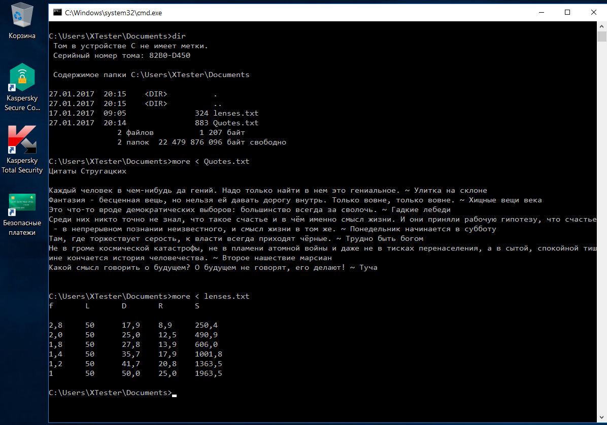 В начале следующего этапа тестирования мы проверили исходное состояние каталога «Мои документы» и вывели содержимое пары текстовых файлов из него в консоль.