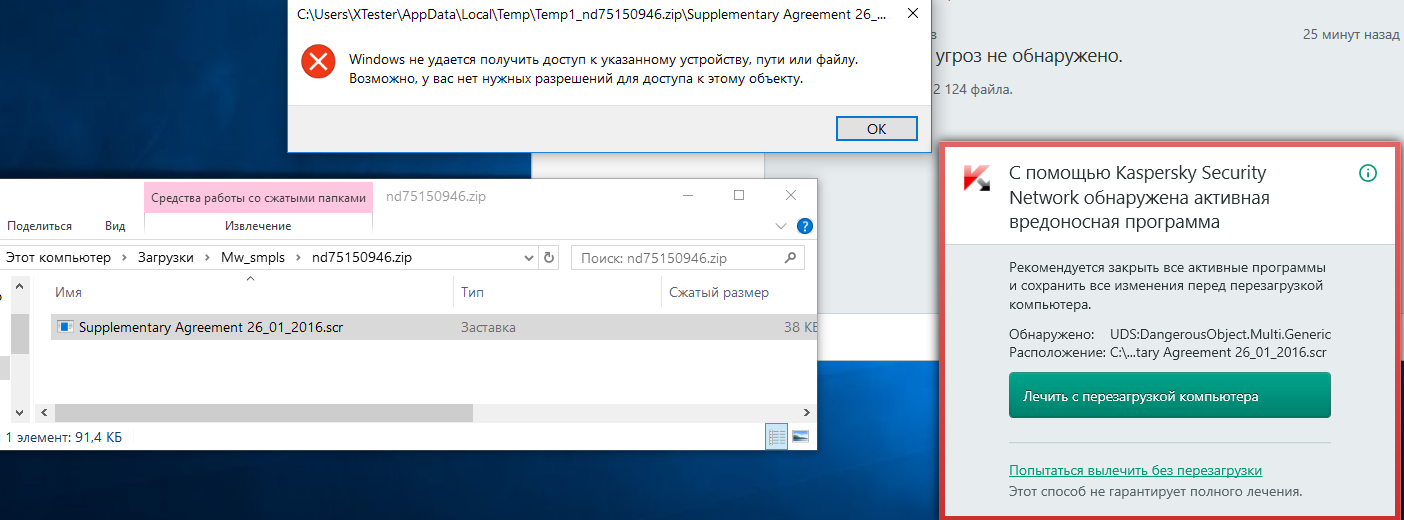 При попытке запустить файл с расширением из архива KTS заблокировал его автоматически распакованную копию во временном каталоге пользователя. По результатам облачного анализа через сеть KSN он определил данный файл как неизвестный вредоносный объект и предложил удалить его с перезагрузкой