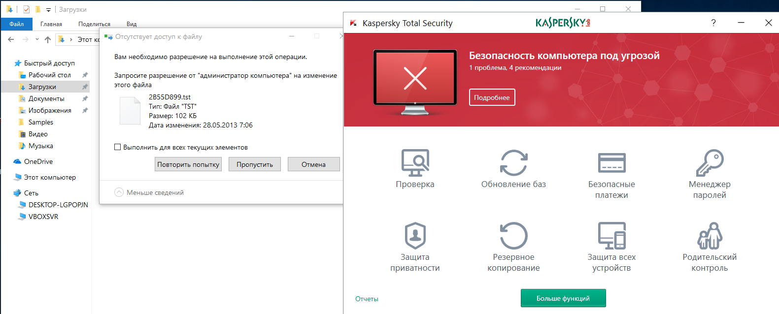 В одну из тестовых виртуалок мы установили Kaspersky Total Security, в котором была обещана «защита от программ-шифровальщиков, предотвращающая порчу файлов вредоносными программами». KTS распознал почти все угрозы уже при попытке скопировать образцы ransomware из сетевой папки.