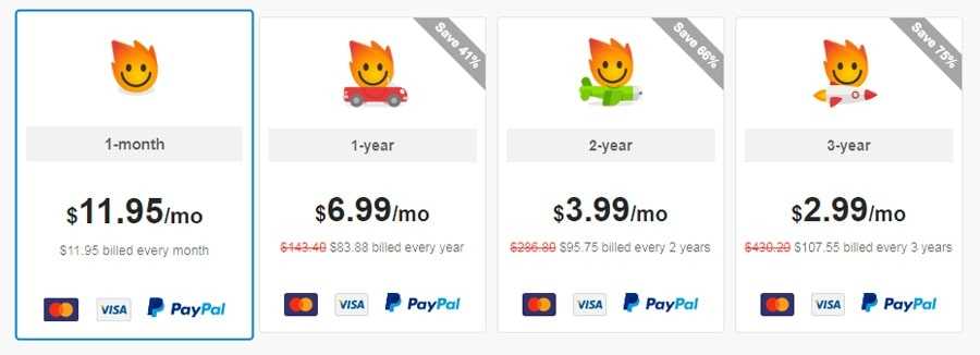 Способы оплаты – кредитные карты и PayPal, анонимных платежей нет. Премиум-план обойдется вам в $11.95 в месяц, а в годовом тарифе – $6.99 в месяц или $2,99 в месяц для 3-летнего плана. Все планы идут с 30-дневной гарантией возврата денег.