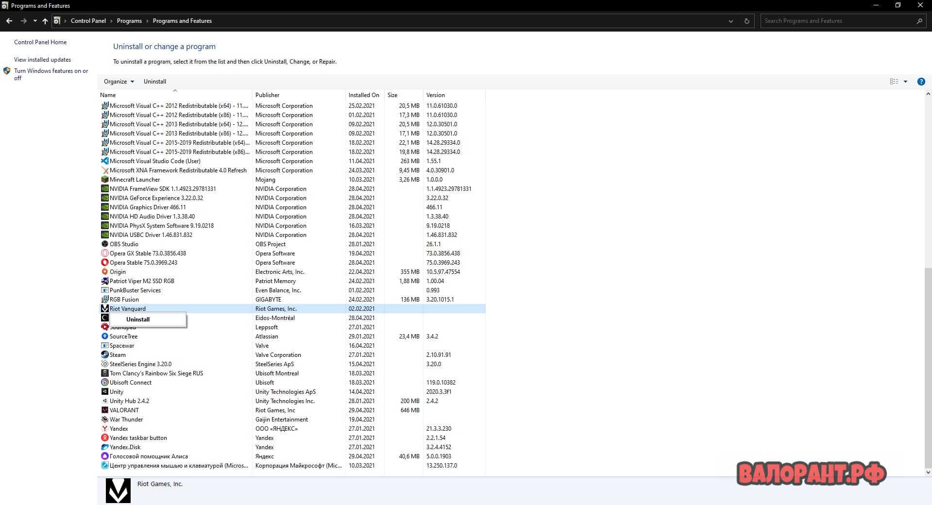 - Жмём по Riot Vanguard правой кнопкой мыши и выбираем «Удалить«/»Uninstall»