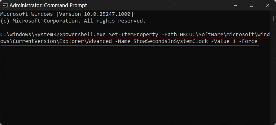 Вы также можете использовать командные терминалы, такие как PowerShell и командная строка, чтобы изменить и отобразить секунды в часах на панели задач. Вот как это сделать с помощью PowerShell: