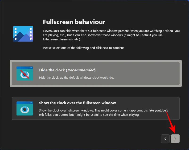 Выберите, хотите ли вы скрыть или показать часы в полноэкранном режиме, затем нажмите стрелку «Далее».