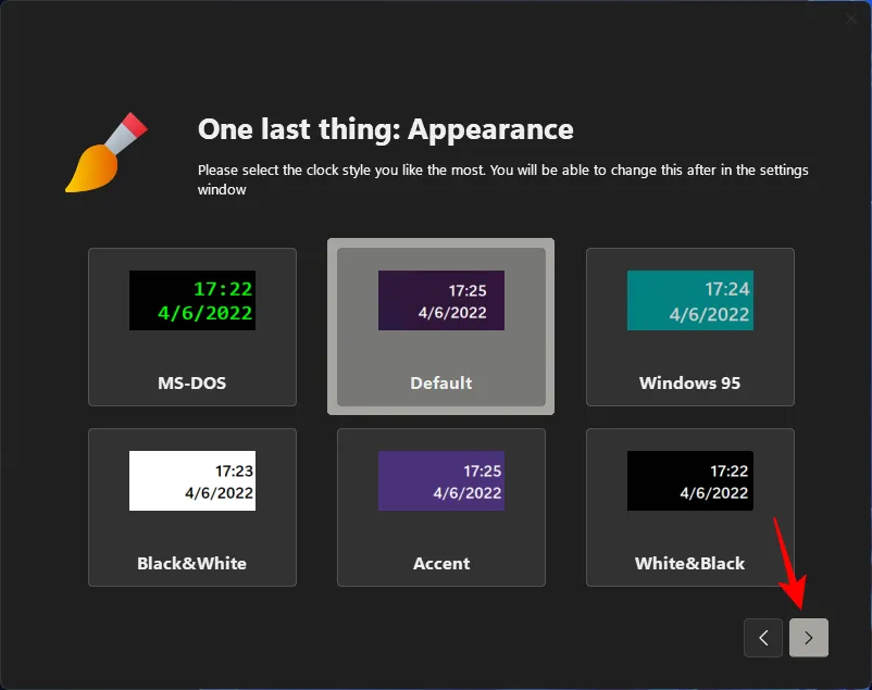 На следующем экране вы сможете выбрать стиль для своих часов. Выберите один, а затем нажмите на следующую стрелку.