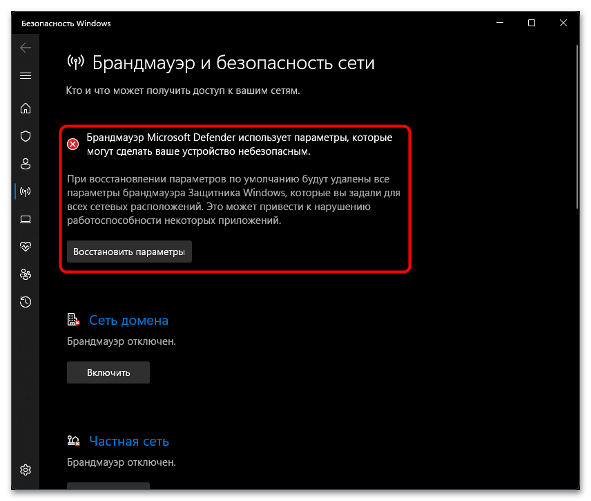 Если вы уже вносили какие-то изменения в работу встроенного межсетевого экрана, вверху будет уведомление о том, что используются нестандартные параметры, которые могут навредить безопасности Windows. Ниже находится кнопка «Восстановить параметры», при помощи которой в любой момент можно будет вернуть стандартные настройки брандмауэра, когда это понадобится.