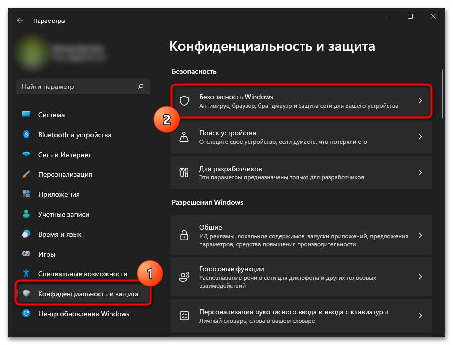 На панели слева выберите раздел «Конфиденциальность и защита», затем кликните по надписи «Безопасность Windows».