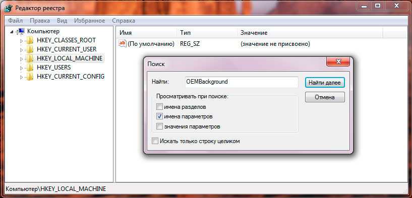 Нас интересует параметр HKEY_LOCAL_MACHINE щелкаем по нему правой клавишей мыши → Найти. В окне поиска вводим OEMBackground (снять флажки со всех опций, кроме имена параметров).