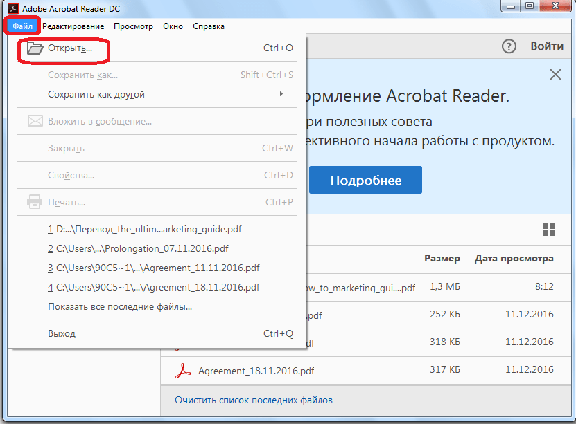 еще одним вариантом открыть нужный файл является запуск самой программы Adobe Acrobat Reader, после открытия которой нужно выбрать раздел «Файл» и перейти к пункту «Открыть», после которого достаточно будет найти нужный файл на вашем компьютере.