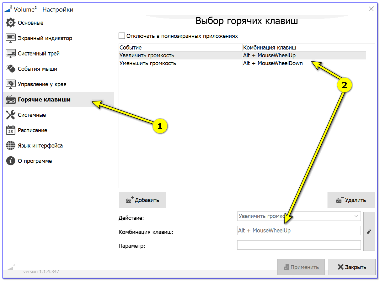 Благодаря горячим клавишам пользователь может создать комбинации с нужными ему событиями: увеличить, уменьшить, выключить громкость, открыть окно настроек или микшер громкости и другие.