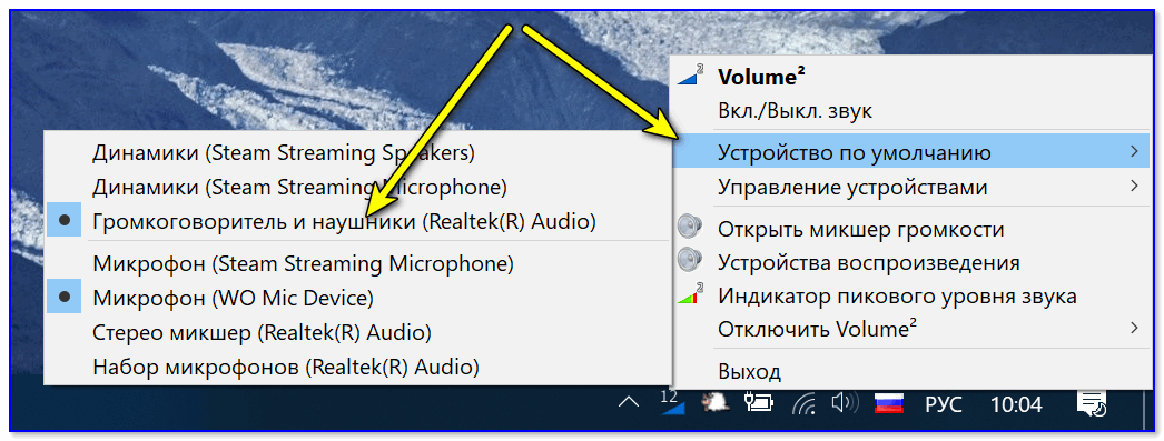 Кстати, не могу также не отметить, что Volume 2 позволяет двумя кликами мышки изменить устройство воспроизведения по умолчанию, включить/выключить микрофоны, колонки, наушники и пр. Пример ниже.