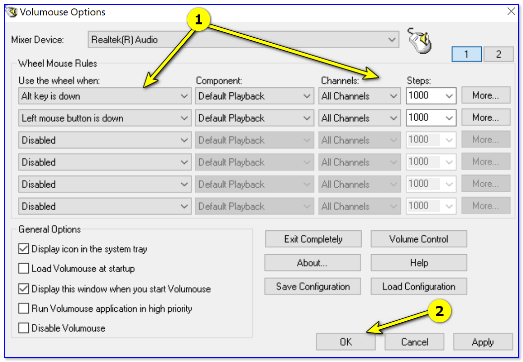 - Если написано, скажем, «Alt key is down», — это значит, что при зажатой кнопке «Alt» программа активируется и колесиком мышки Вы сможете менять громкость. Соответственно, везде, где «is down» (Left Mouse, Shift key и пр.), — это параметр зажатой кнопки;