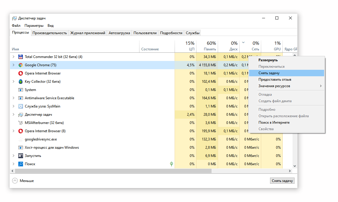 6. Чтобы отключить ненужные процессы / приложения, нажмите правой кнопкой мыши по строке и выберите функцию «Снять задачу».